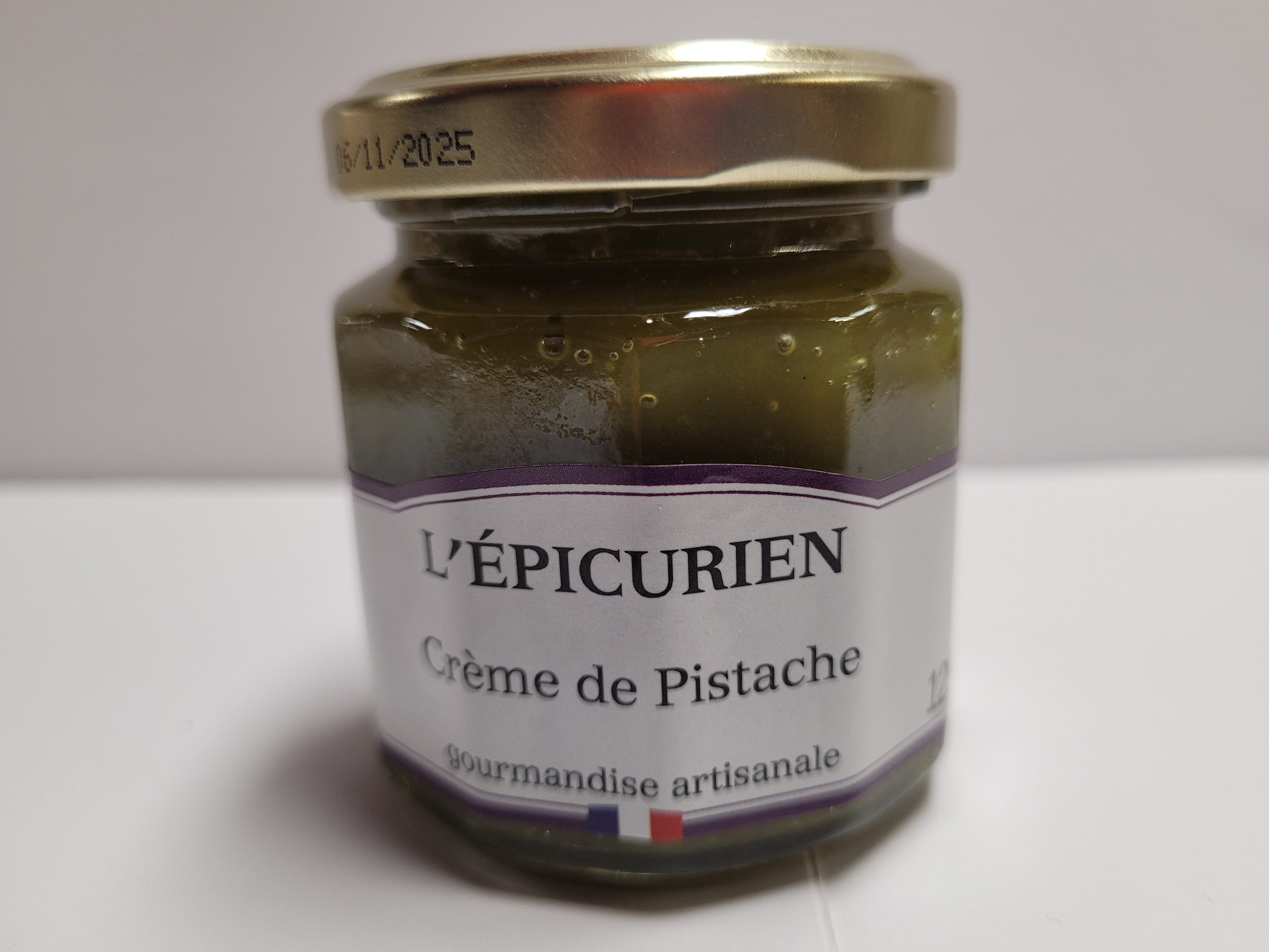sucre de canne, eau, beurre concentré, œuf entier liquide pasteurisé, pâte de pistache, E100, E141, jaune d’œuf en poudre pasteurisé, jus concentré de citron, lécithine se soja, gélifiants, arômes naturel