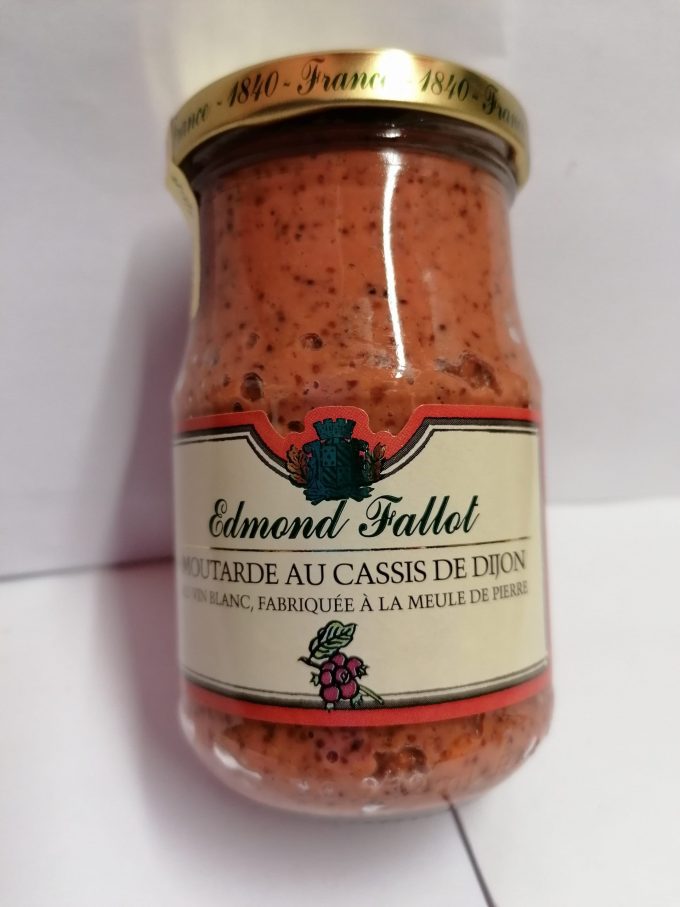 Eau, graines de moutarde, vin blanc, vinaigre, crème de cassis de Dijon, sel, arôme naturel cassis, téguments de moutarde, sucre, carmin de cochenille 205g
