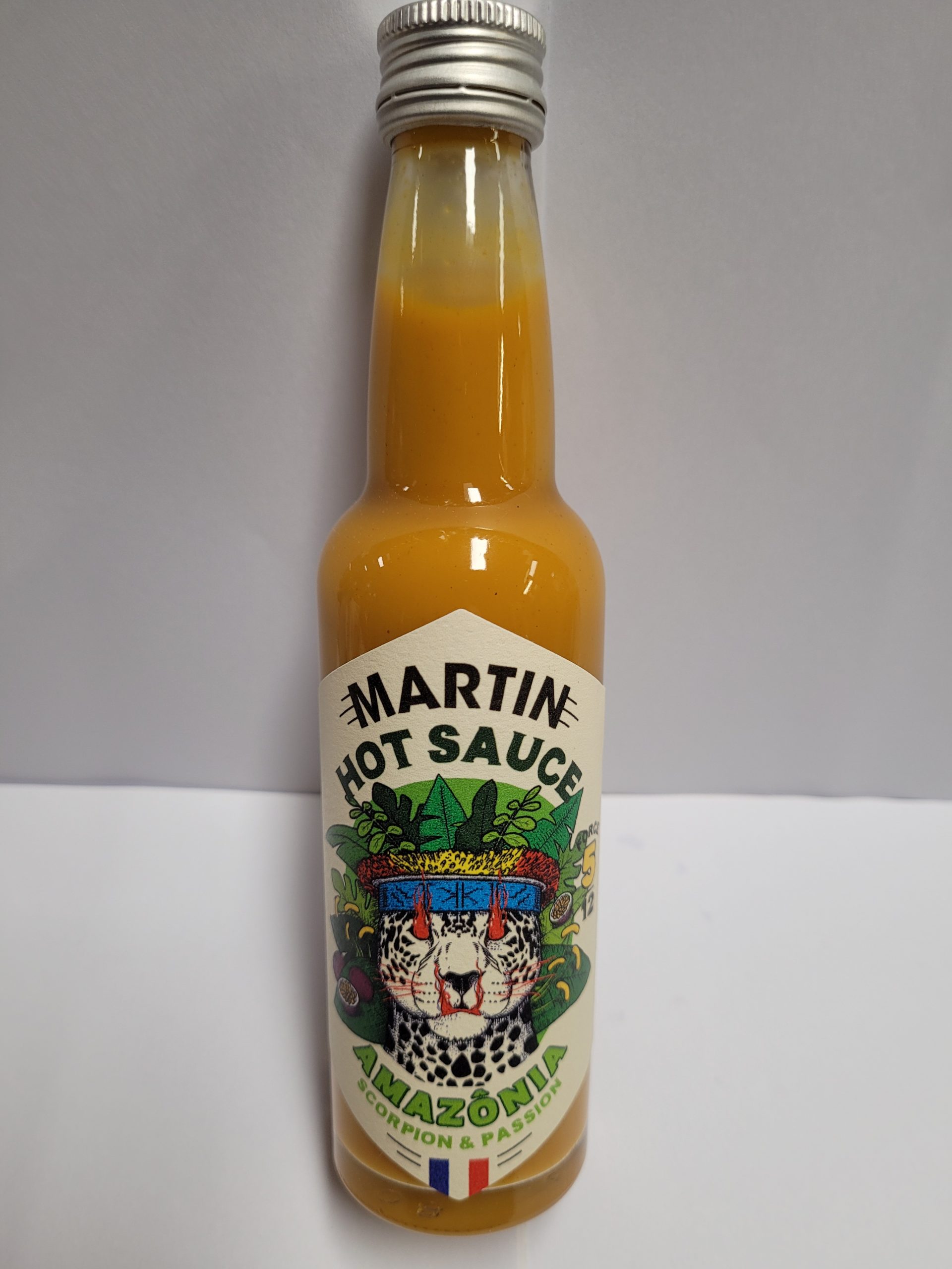Composition: fruit de la passion, sucre, jus de citron vert, lait de coco, purée de piment Trinidad Scorpion Moruga, ail et épices , sel, gomme naturelle végétale de xanthane
